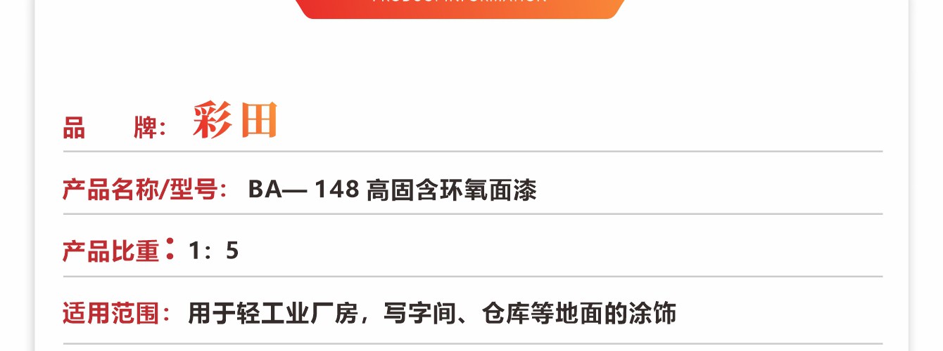 常溫固化雙組份環氧樹脂漆,層光滑、光亮、豐滿度好;溶劑含量低,大大改善施工環境。適用于輕工業廠房,寫字間、倉庫等地面的涂飾。