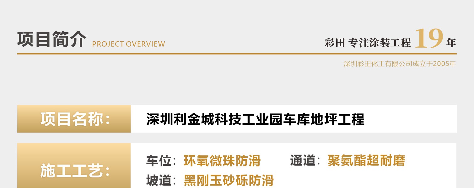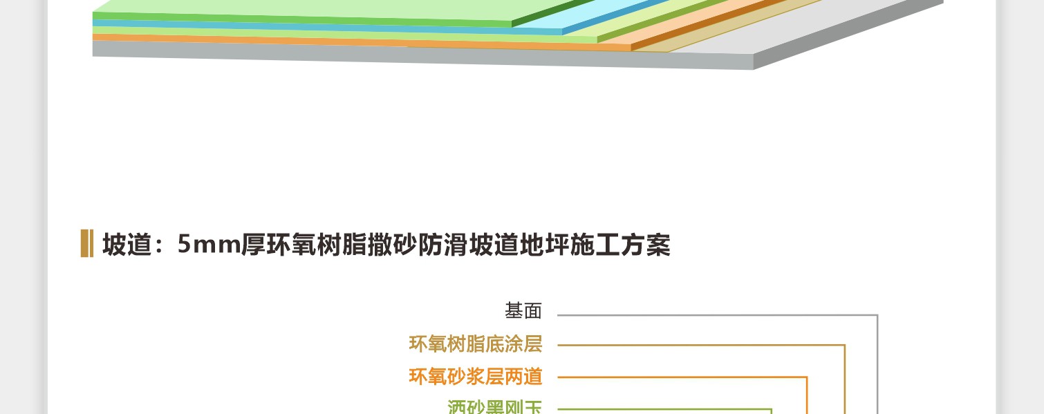 項目名稱:/深圳利金城科技工業(yè)園地下車庫地坪工程施工工藝:/車位:環(huán)氧微珠防滑 通道:聚氨酯超耐磨 坡道:黑鋼玉砂礫防滑施工面積:施工工期:色彩搭配方案:涂裝體系結構: