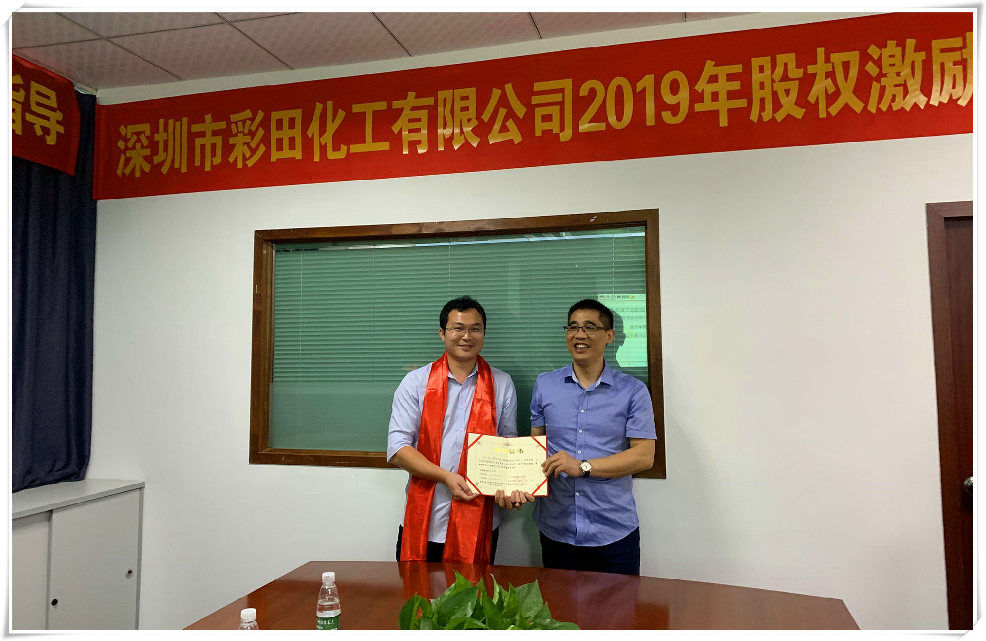 簽約儀式正式開始,由深圳市彩田化工有限公司法人肖建軍依次與本次首批股權激勵人員簽署股權激勵協(xié)議書,并由彩田化工總經理全偉頒發(fā)紅本股權證書,彩田化工制造部總經理聶朝陽親切的獻上哈達,并依次與股權激勵人員合影留念。