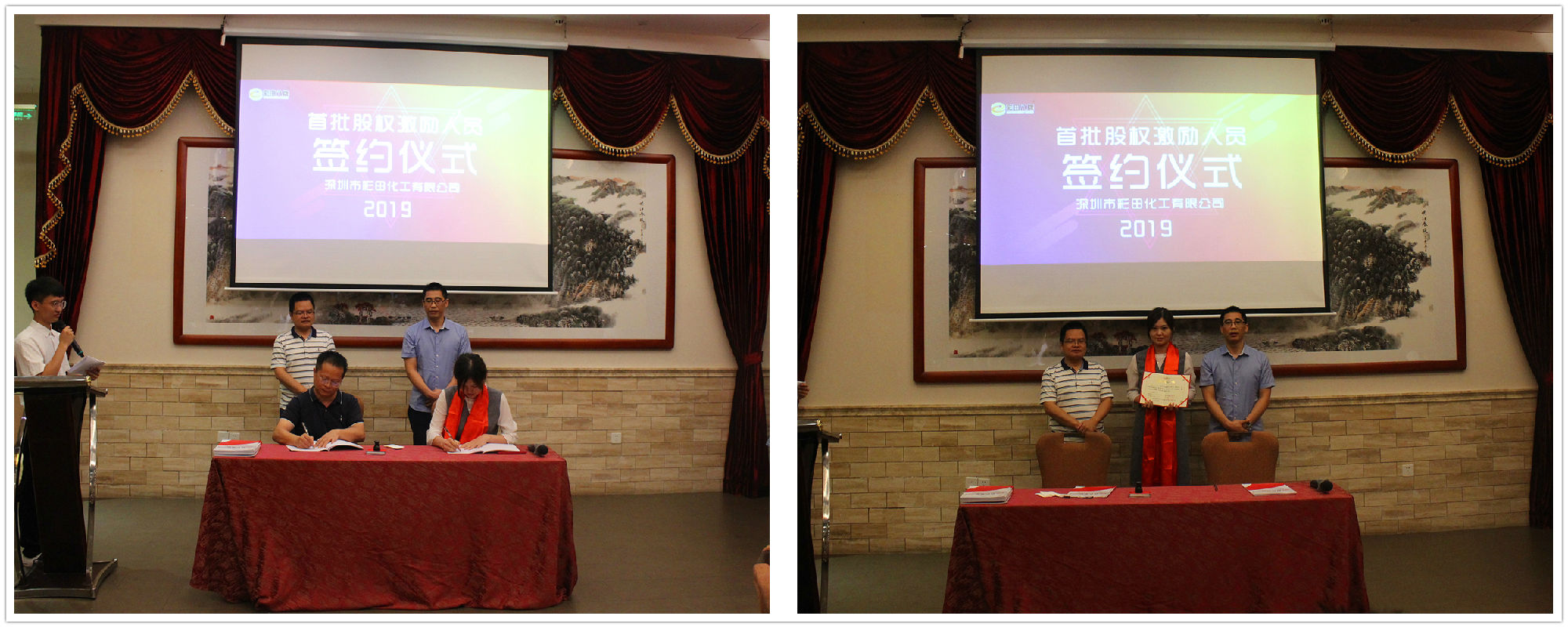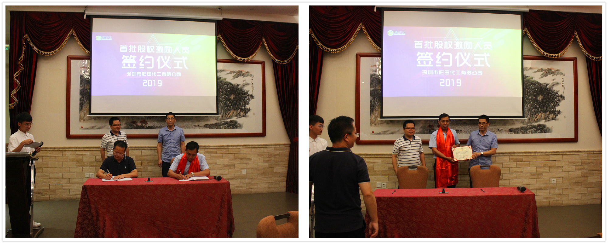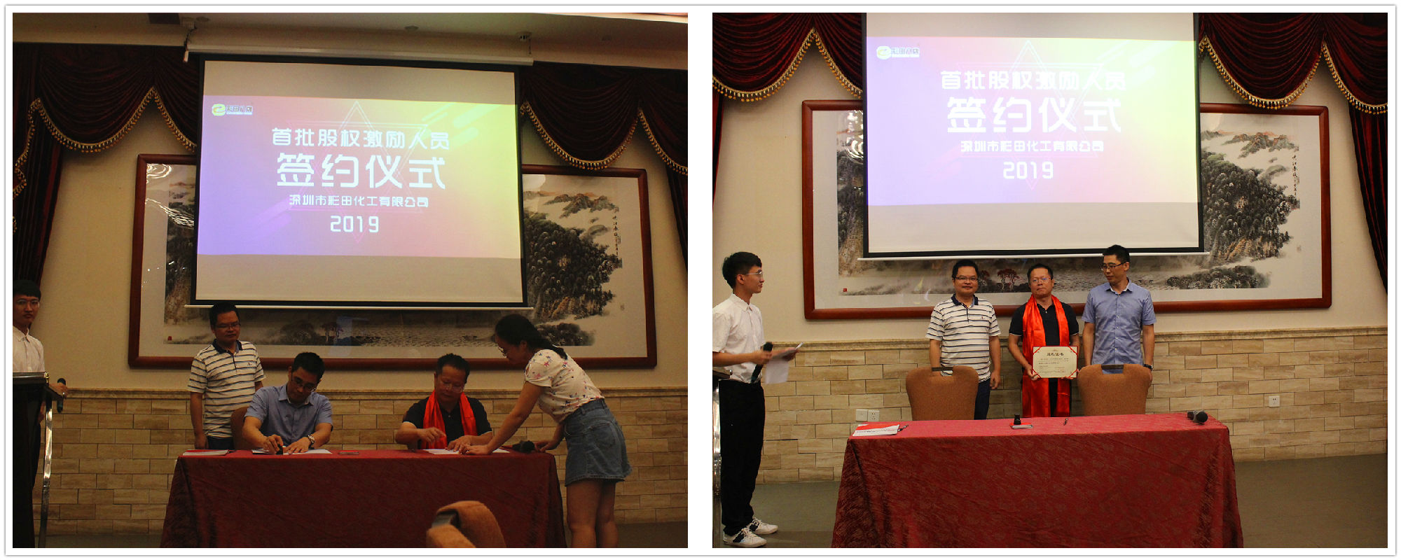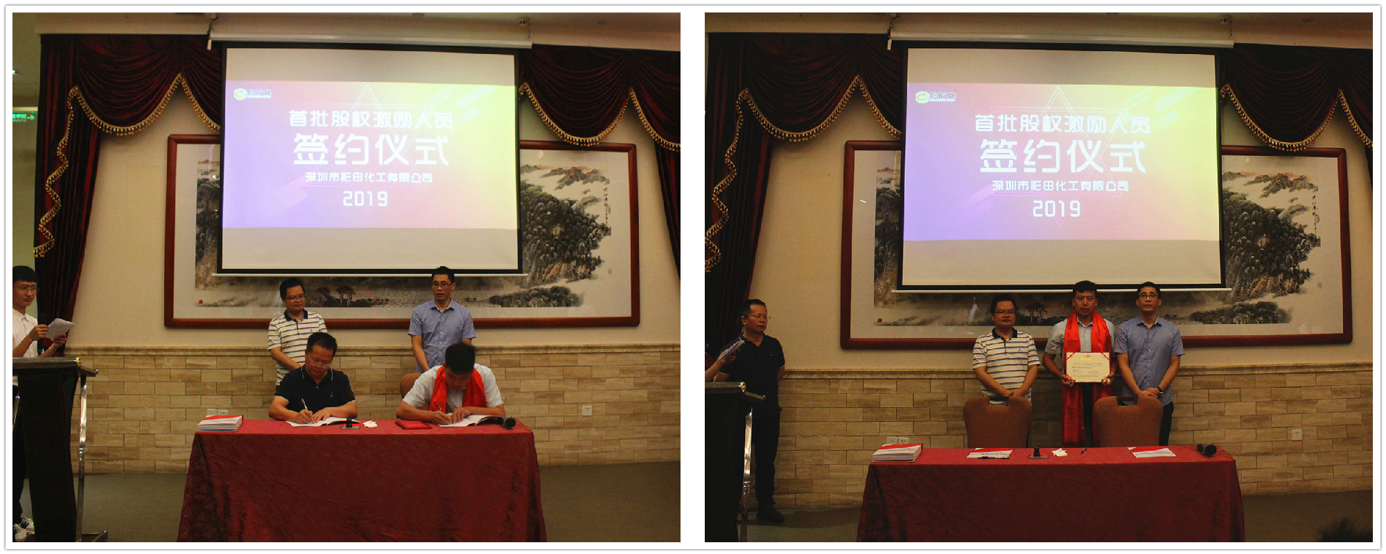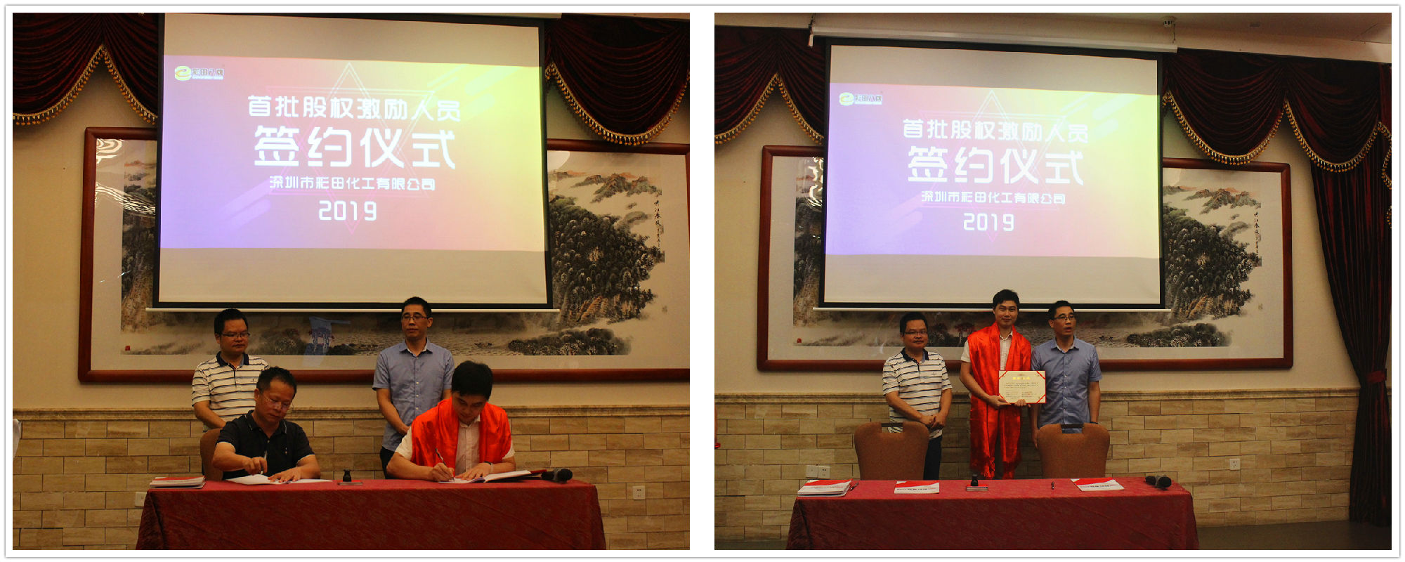 2019年7月20日18:20,深圳市彩田化工有限公司首批股權激勵人員簽約儀式在清遠國際酒店宴會廳隆重舉行!公司全體人員及家屬代表匯聚一堂,共同見證了這一重要的、具有里程碑意義的篇章。