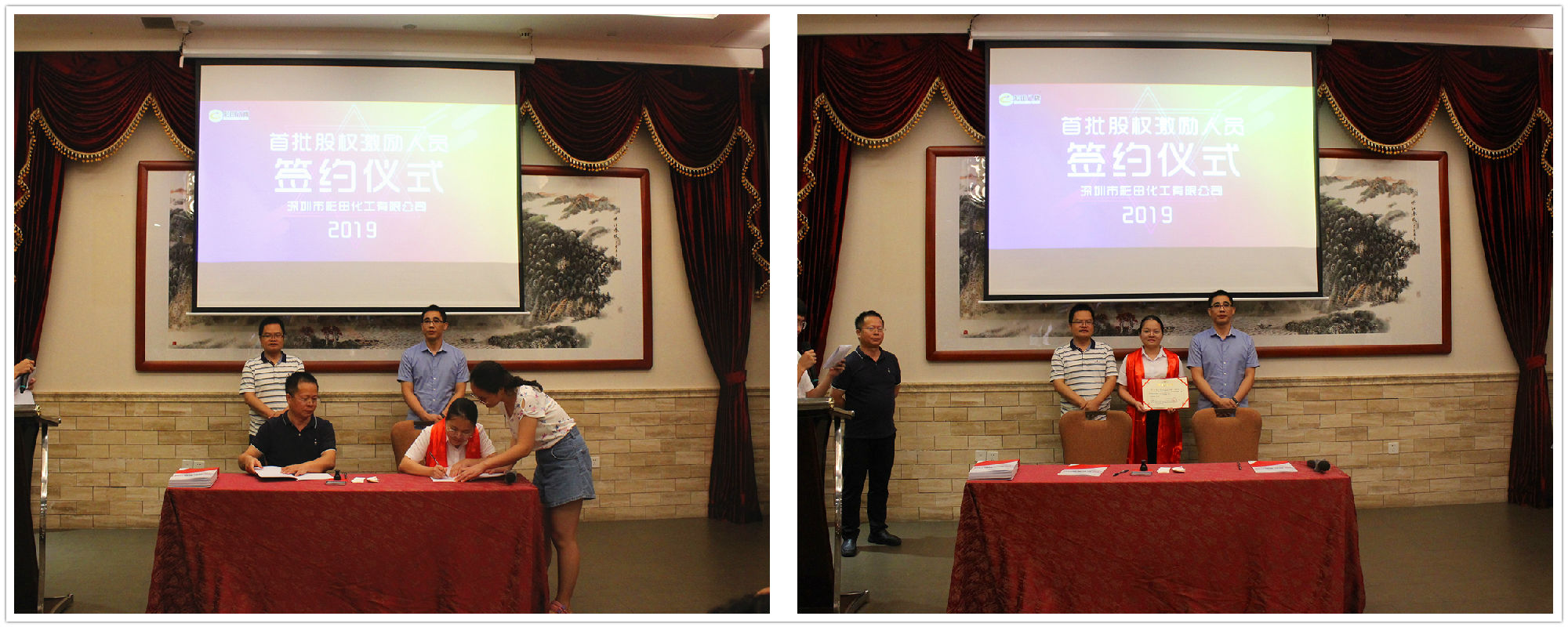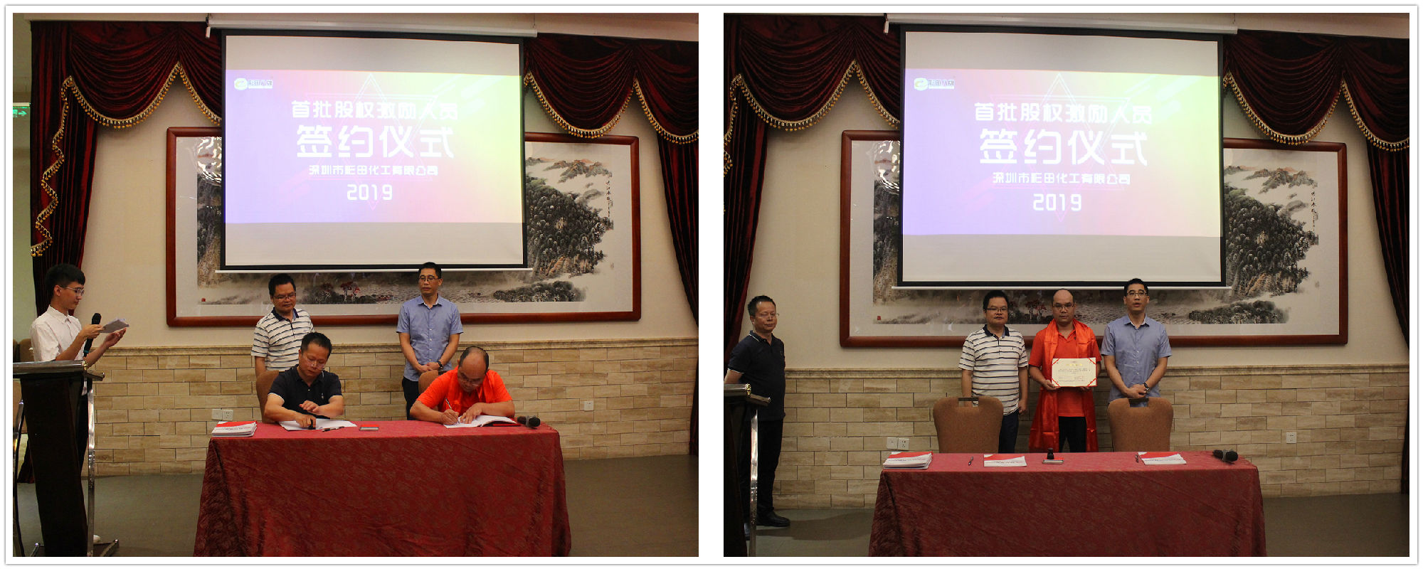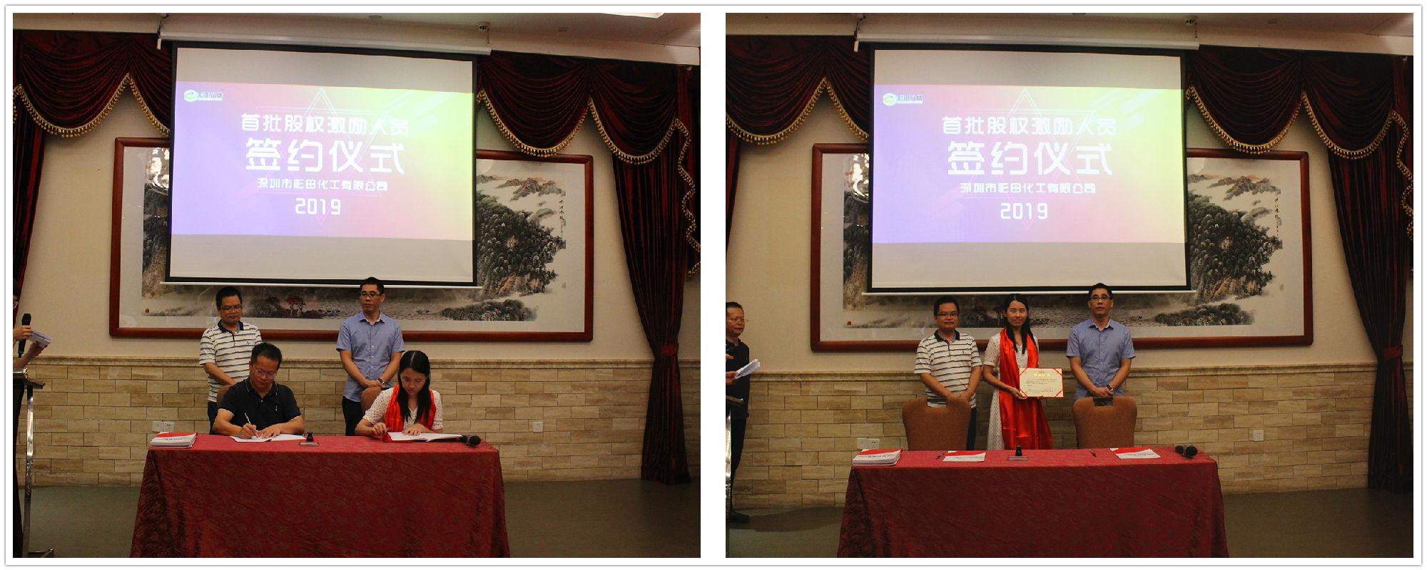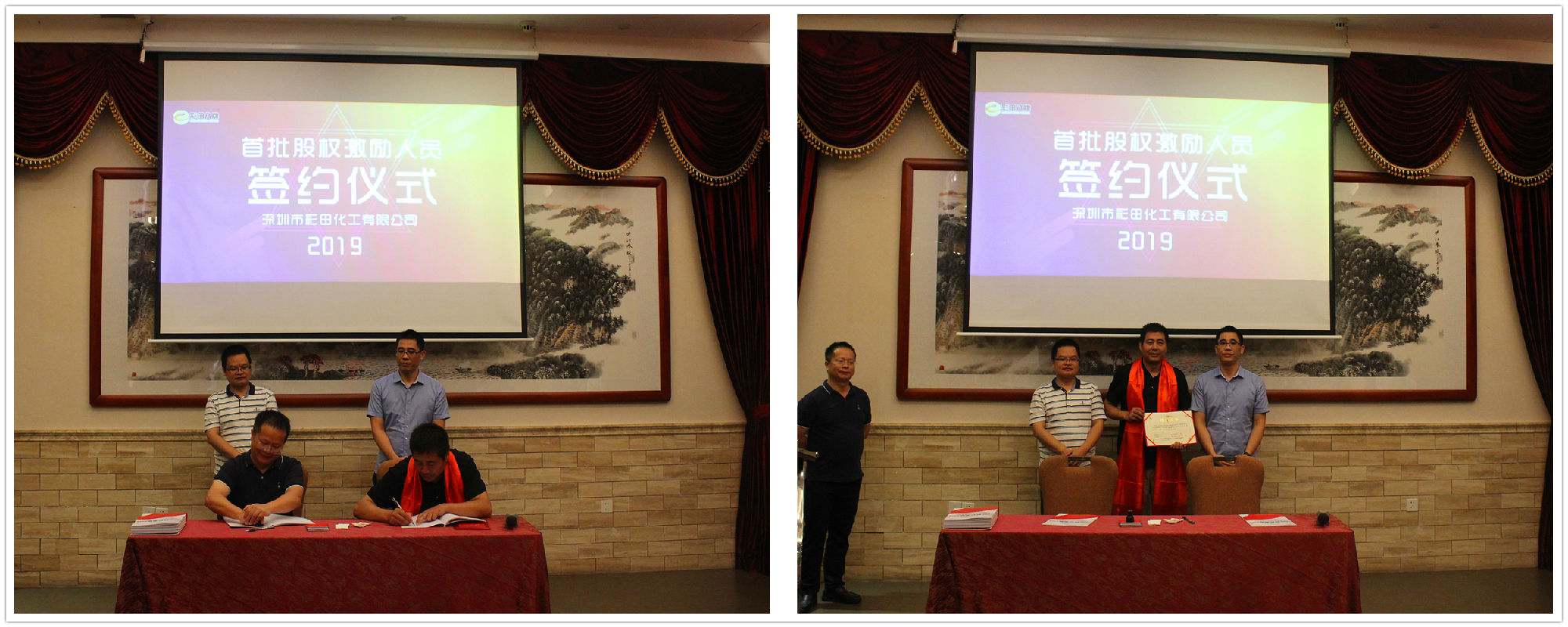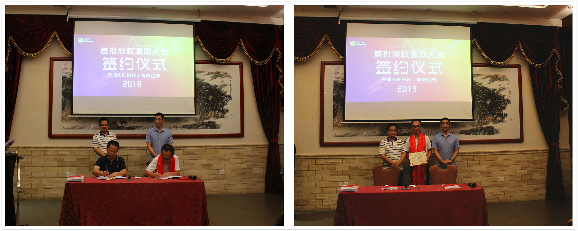 2019年7月20日18:20,深圳市彩田化工有限公司首批股權激勵人員簽約儀式在清遠國際酒店宴會廳隆重舉行!公司全體人員及家屬代表匯聚一堂,共同見證了這一重要的、具有里程碑意義的篇章。