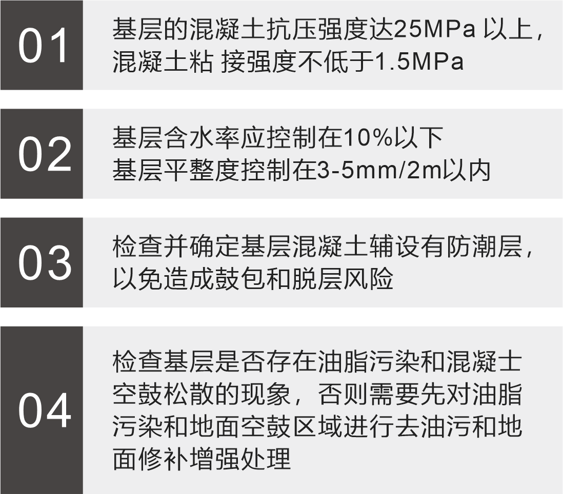 要求: 清除舊地坪,去除松散結(jié)構(gòu),提供粗糙、清潔、堅(jiān)實(shí)的基層。如果基層有空鼓、開裂現(xiàn)象,則需要鑿除、切割并修理找平。對(duì)于新混凝土基層要求水泥標(biāo)號(hào)達(dá)C25以上,砼養(yǎng)護(hù)15天以上。