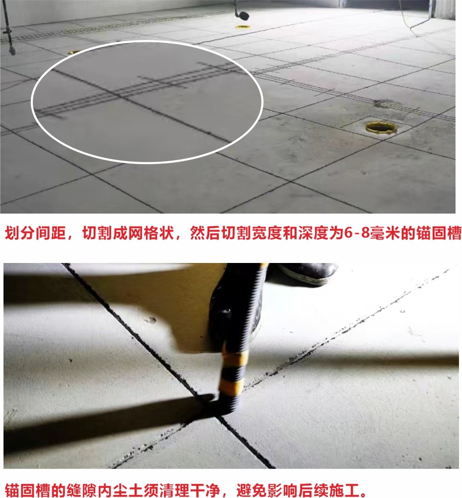 要求:錨固槽必須垂直規(guī)整,寬度、深度應(yīng)達(dá)到地坪厚度的2倍,且最小要達(dá)到5毫米,距墻邊小于100毫米(越近越好),與墻體保持平行,并且其圍繞的面積不超過(guò)25平方米。