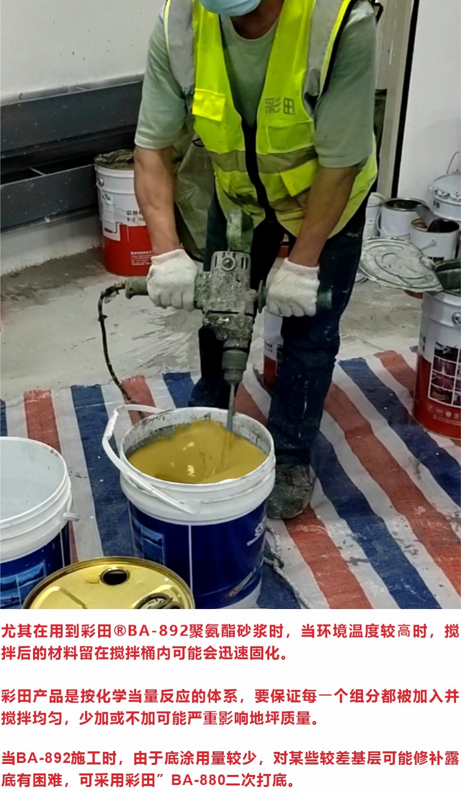 4) 逐漸加入C組分,同時(shí)繼續(xù)攪拌,直到混合均勻,沒有聚集顆粒,一般需2分鐘。彩田產(chǎn)品是按化學(xué)當(dāng)量反應(yīng)的體系,要保證每?個(gè)組分都被加?并攪拌均勻,少加或不加可能嚴(yán)重影響地坪質(zhì)量。