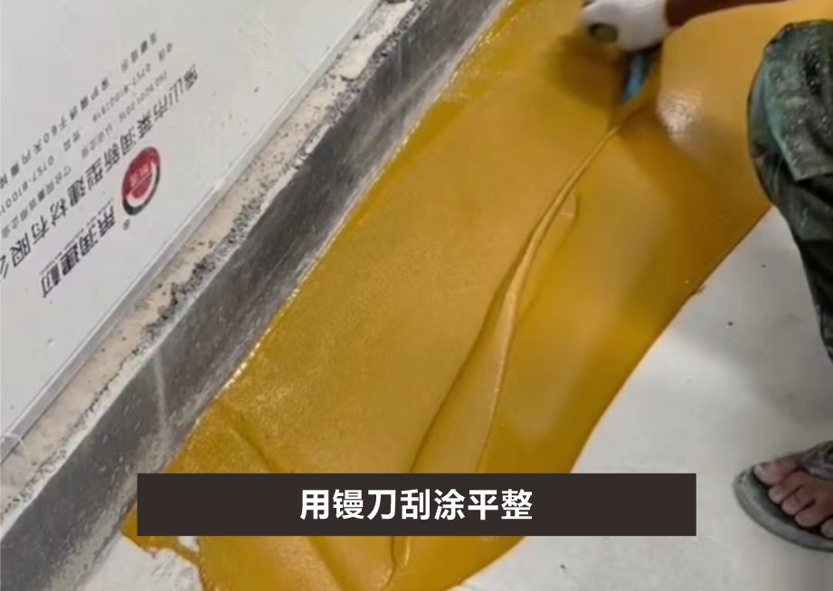攪拌完成后,立刻運(yùn)到現(xiàn)場(chǎng)倒在待施工表面(待施工表面溫度8℃以上),使用耙子或鏝刀將材料鋪攤成均勻的目標(biāo)厚度,并立刻使用消泡滾筒以十字交叉方式對(duì)材料進(jìn)行消泡一到二次。