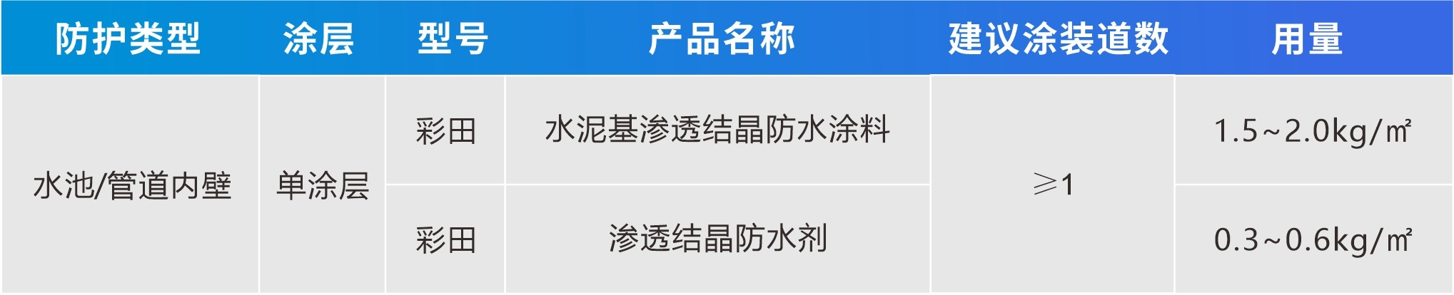 本方案采用滲透結(jié)晶單涂層體系,即安全無(wú)毒、高滲透性和強(qiáng)封閉性的滲透結(jié)晶型涂料對(duì)池壁進(jìn)行防水防護(hù)。涂刷后的涂料滲透到混凝土的孔隙中發(fā)生原位固化交聯(lián),能有效封閉混凝土的微觀孔隙并對(duì)基面微裂縫具有自修復(fù)能力。阻擋水及其他介質(zhì)進(jìn)入混凝土,防止有害物質(zhì)析出到飲水中。實(shí)現(xiàn)對(duì)混凝土的結(jié)構(gòu)增強(qiáng)及對(duì)飲用水水質(zhì)保護(hù)的雙重功能。