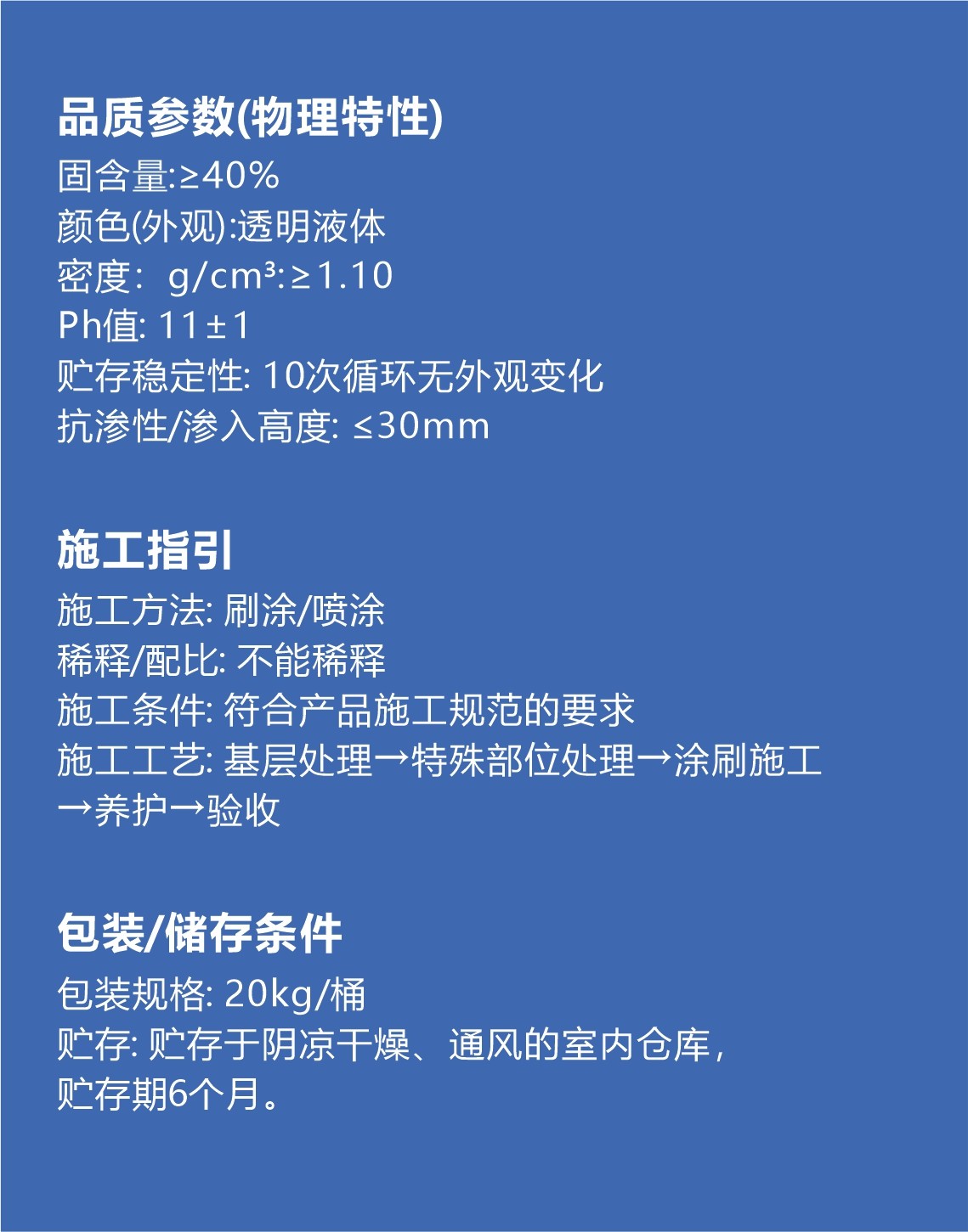 3、具有滲透功能,能通過化學(xué)反應(yīng)滲透到混凝土內(nèi)部產(chǎn)生結(jié)晶堵住混凝土的毛細(xì)孔。