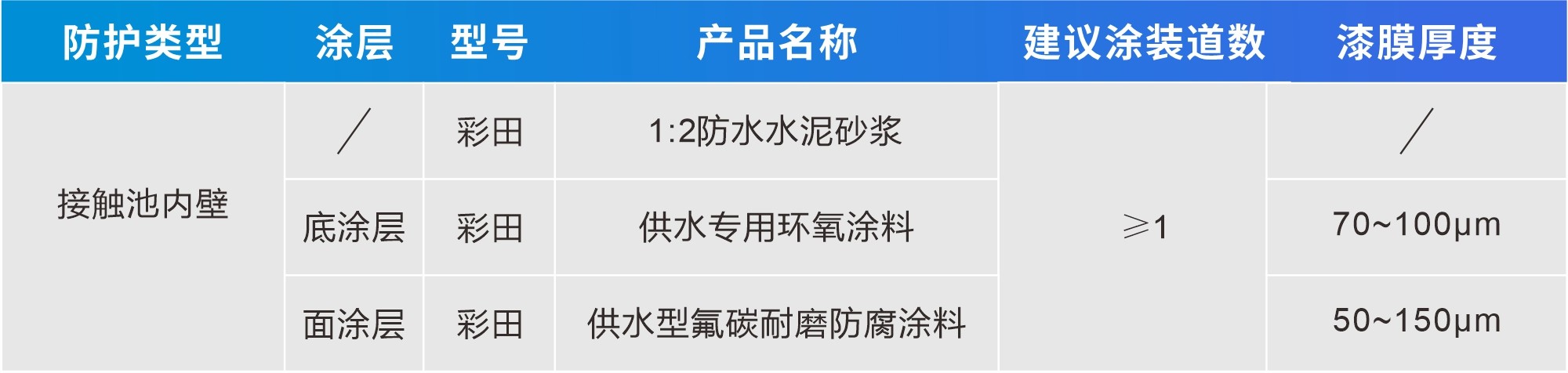 本方案采用防水防腐耐候抗紫外底中面三層涂裝體系,來滿足臭氧接觸池的防護需求。1:2防水水泥砂漿找平基面,同時,在底層實現防水抗滲;供水專用環氧涂料提升涂層的附著力和柔韌性;供水型氟碳耐磨防腐涂料提升涂層的超級耐候、抗紫外、強防腐防污的性能。
