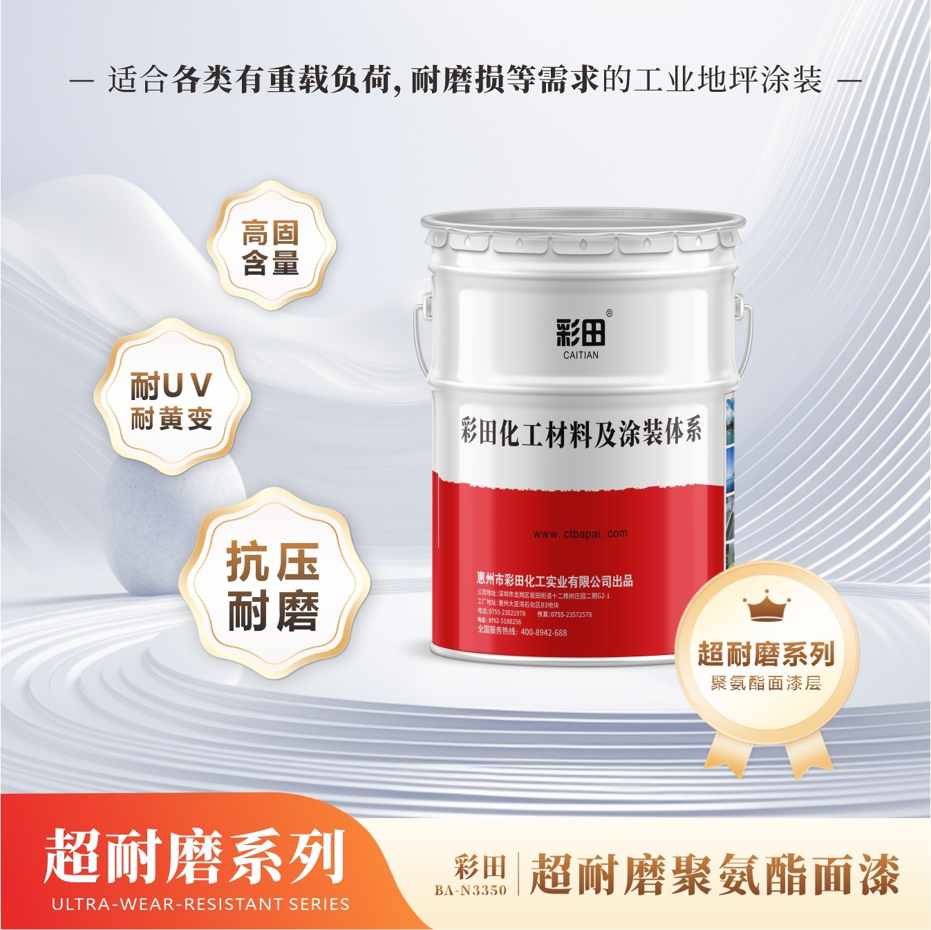 彩田聚氨酯超耐磨面漆的抗劃傷性能、耐候性和耐磨性能,比普通環氧耐磨性高3倍,也高于一般的水性聚氨酯。表面的細小顆粒紋理可以降低輪胎的摩擦噪音;對污垢、油墨、普通酸堿,特別是輪胎摩擦留下的黑印具有極好的抵抗性。