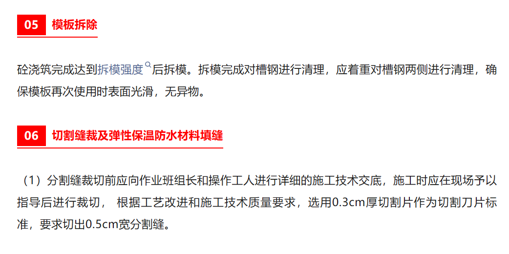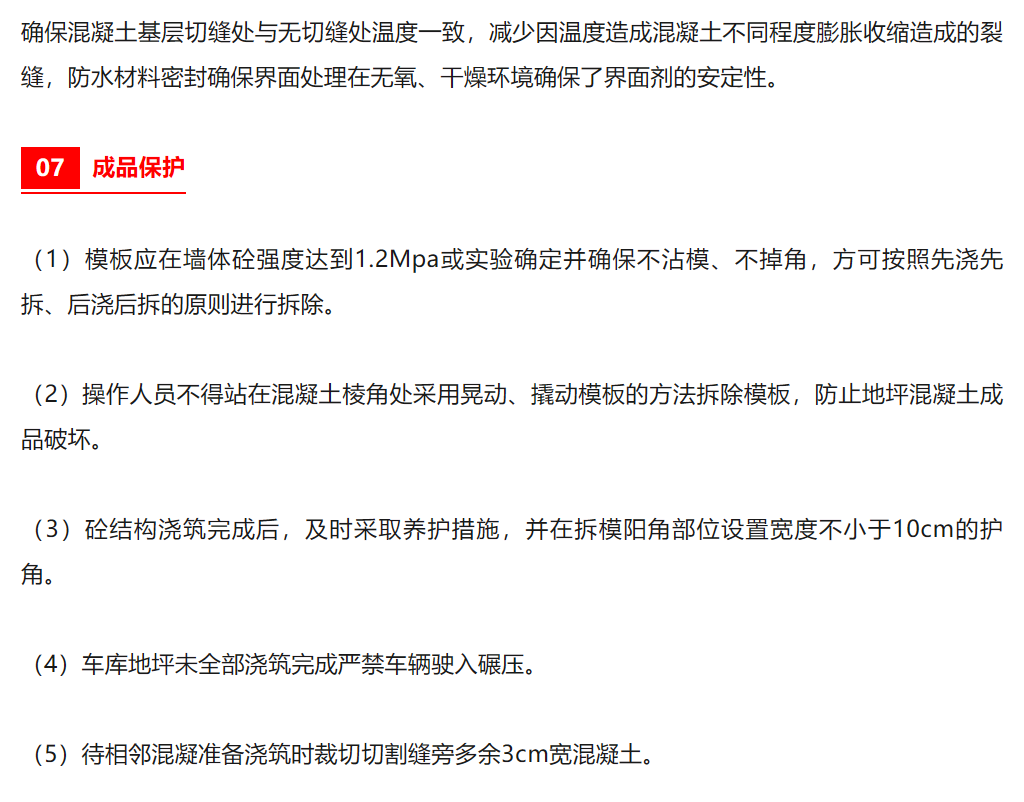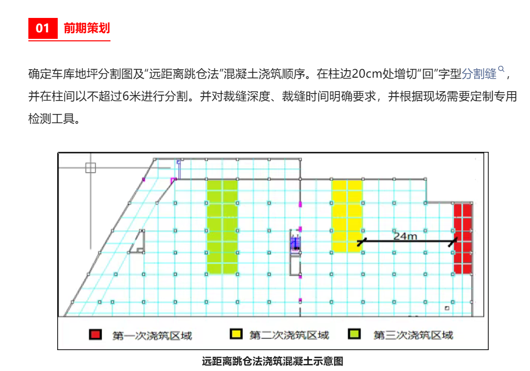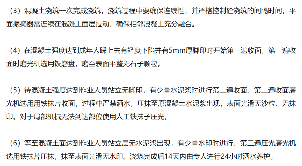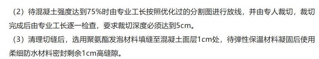 3、混凝土澆筑中使用“遠距離跳倉法”施工(第二天澆筑場地距第一天澆筑保持距離,確保澆筑中機械、車輛不擾動上次澆筑的混凝土)三遍壓光施工。“遠距離跳倉法”避免因澆筑中車輛震動造成前期澆筑混凝土與基層板面分離造成空鼓,三遍壓光確保了混凝土密實度,及混凝土干縮造成裂縫。4、彈性保溫防水材料填縫:清理切縫后,選用聚氨酯發泡材料填縫至混凝土面層。確保混凝土基層切縫處與無切縫處溫度一致,減少因溫度造成混凝土不同程度膨脹收縮造成的裂縫,防水材料密封確保界面處理在無氧、干燥環境確保了界面劑的安定性。