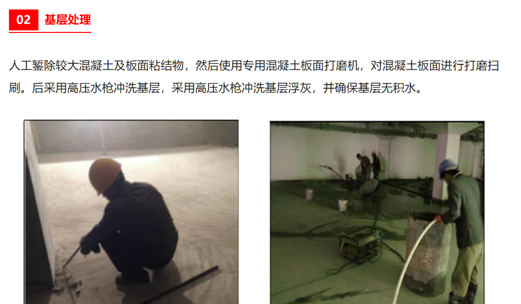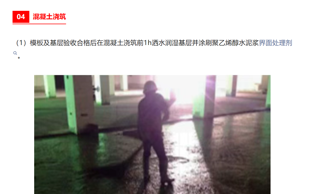 - 混凝土澆筑前潤濕基層后涂刷新型聚乙烯醇界面粘合劑,增加混凝土面層和基層板面的粘結度。