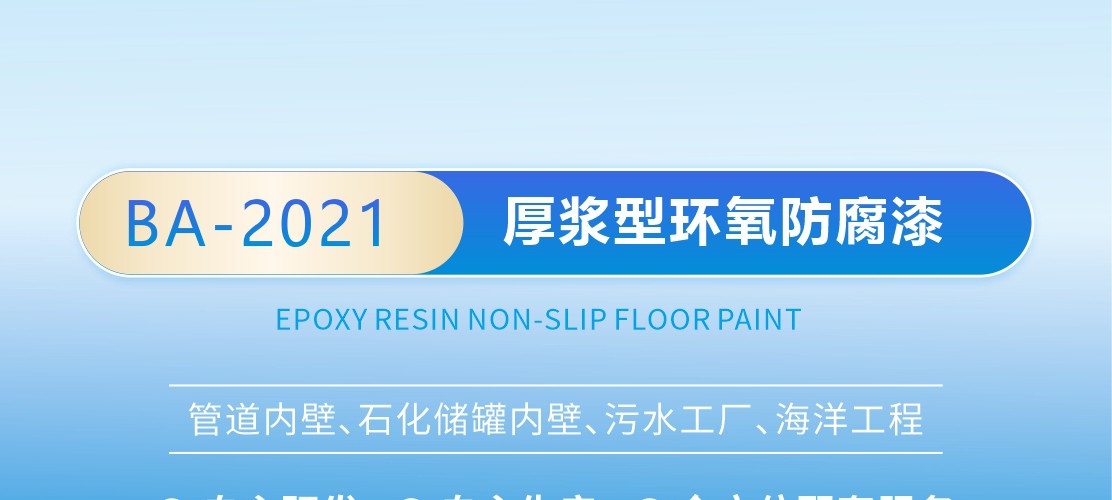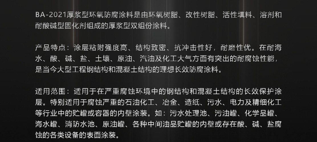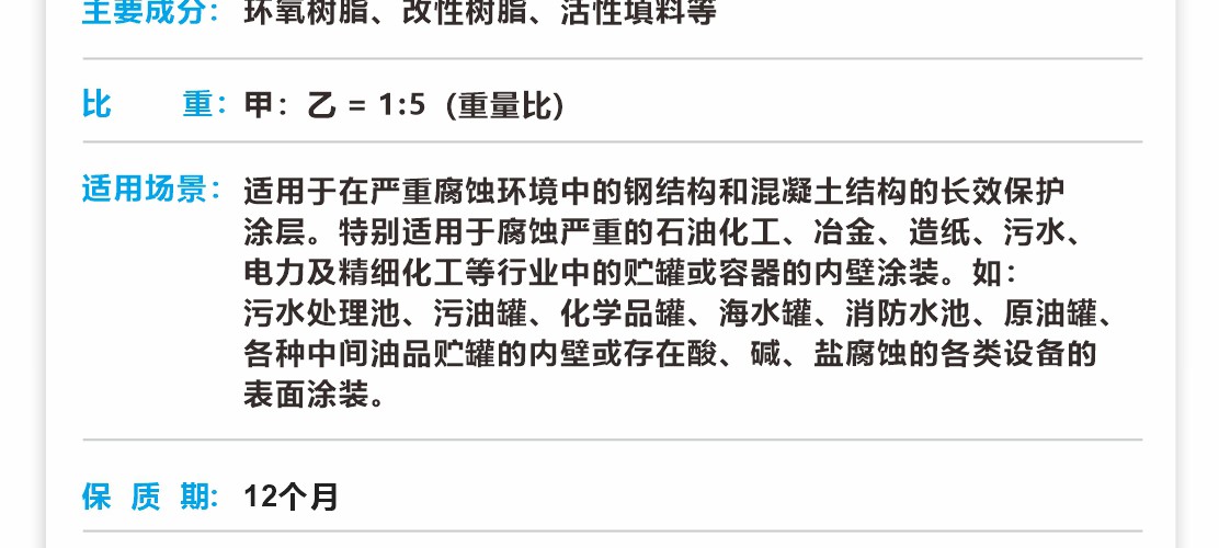 彩天化工 | 厚漿型環氧防腐涂料是由環氧樹脂、改性樹脂、活性填料、溶劑和耐酸堿型固化劑組成的厚漿型雙組份涂料。 產品特點:涂層粘附強度高、結構致密、抗沖擊性好,耐磨性優。在耐海水、酸、堿、鹽、土壤、原油、汽油及化工大氣方面有突出的耐腐蝕性能,是當今大型工程鋼結構和混凝土結構的理想長效防腐涂料。 適用范圍:適用于在嚴重腐蝕環境中的鋼結構和混凝土結構的長效保護涂層。特別適用于腐蝕嚴重的石油化工、冶金、造紙、污水、電力及精細化工等行業中的貯罐或容器的內壁涂裝。如:污水處理池、污油罐、化學品罐、海水罐、消防水池、原油罐、各種中間油品貯罐的內壁或存在酸、堿、鹽腐蝕的各類設備的表面涂裝。
