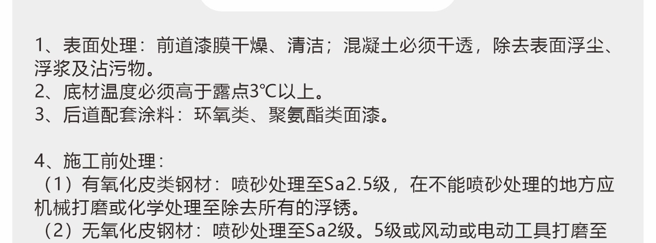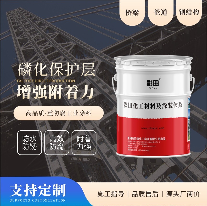 彩田的環氧磷化底漆是由環氧樹脂、磷酸鋅等防銹顏料、助劑、溶劑等組成的雙組份環氧樹脂涂料。?? 特性: 防銹性能優異,附著力、柔韌性、耐沖擊性優良,良好的耐鹽霧、耐水性和防銹性能,與彩田的環氧漆體系具有良好的配套性。 用途: 用于濕熱環境中使用的設備,陸上鋼結構、鋼鐵機械、設備和船舶水線以上鋼板部位的防腐。