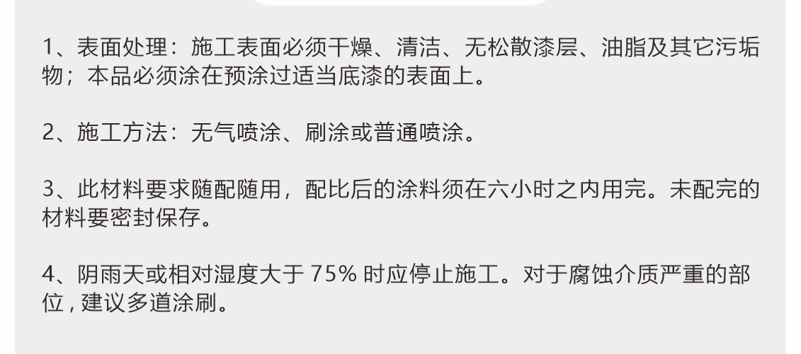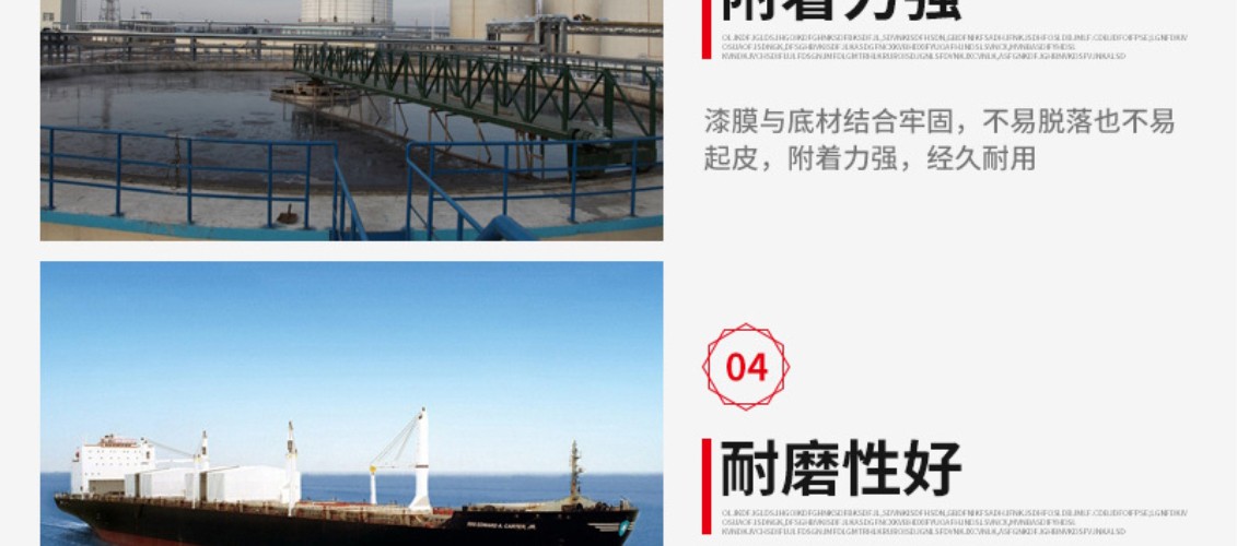 厚漿雙組份聚酰胺固化環氧煤焦瀝青涂料,固化后可形成具有優異的耐水性和柔韌性漆膜,可耐磨損、耐海水、耐原油和燃油等,本品不僅具有環氧漆類的堅硬、耐磨和耐化學品性能,而且具有瀝青漆類的耐水特性。