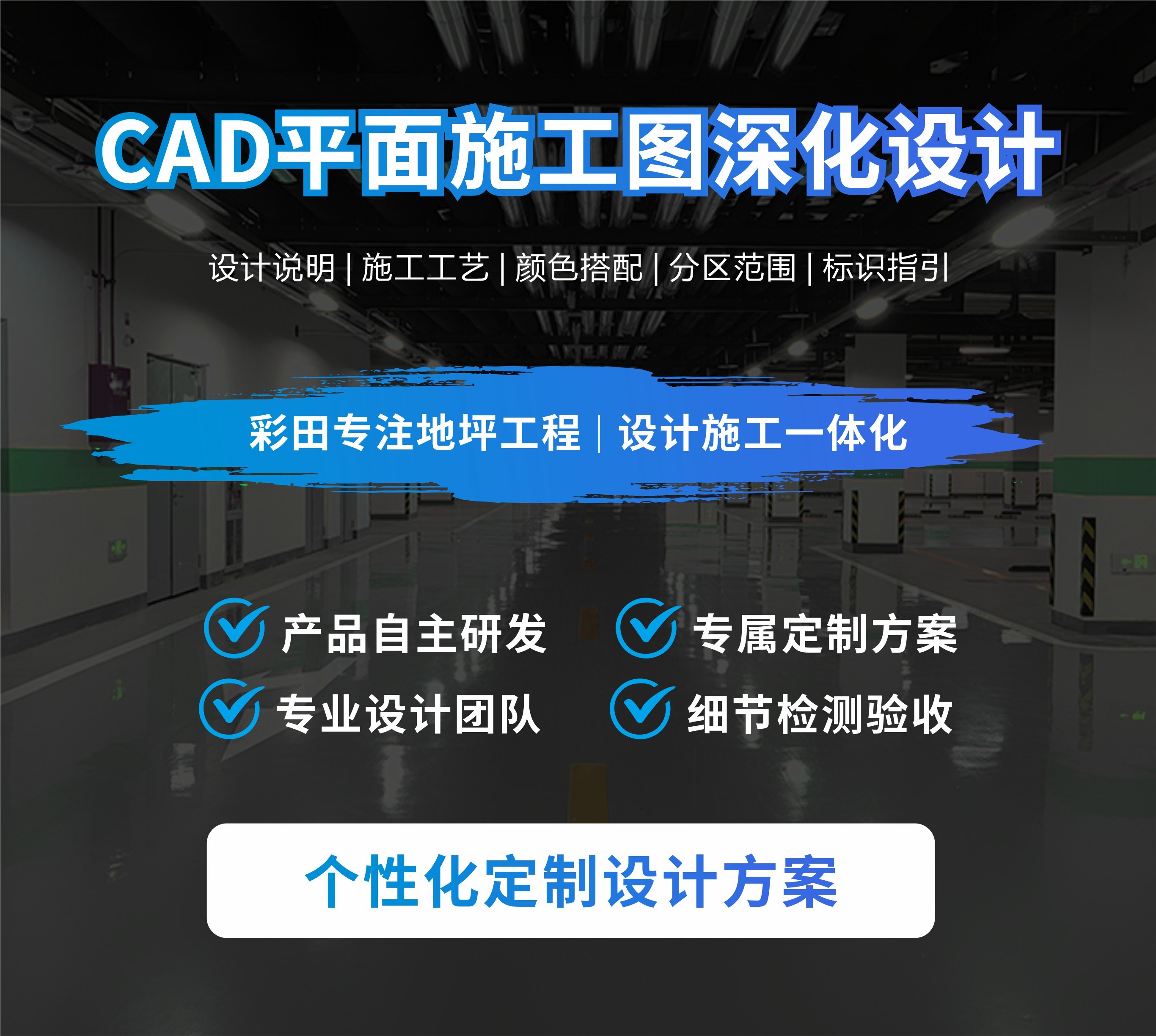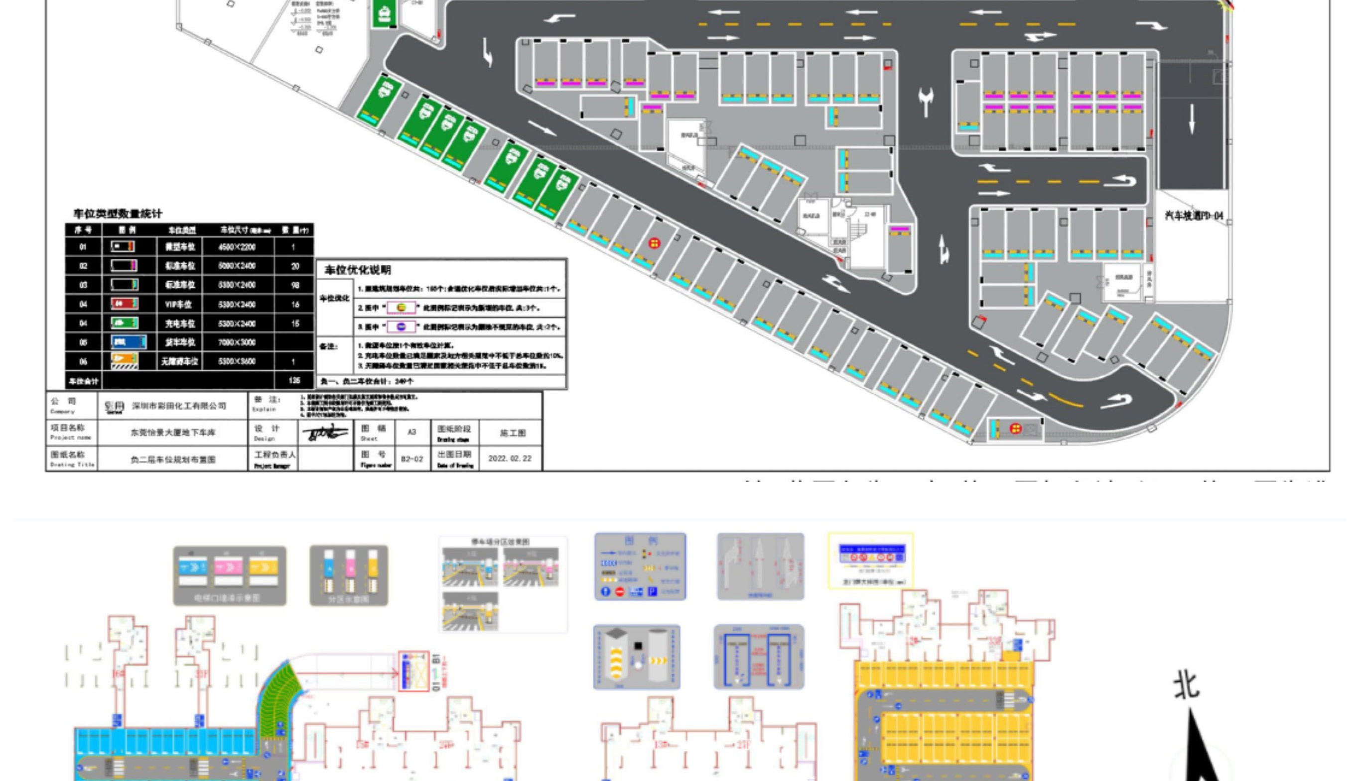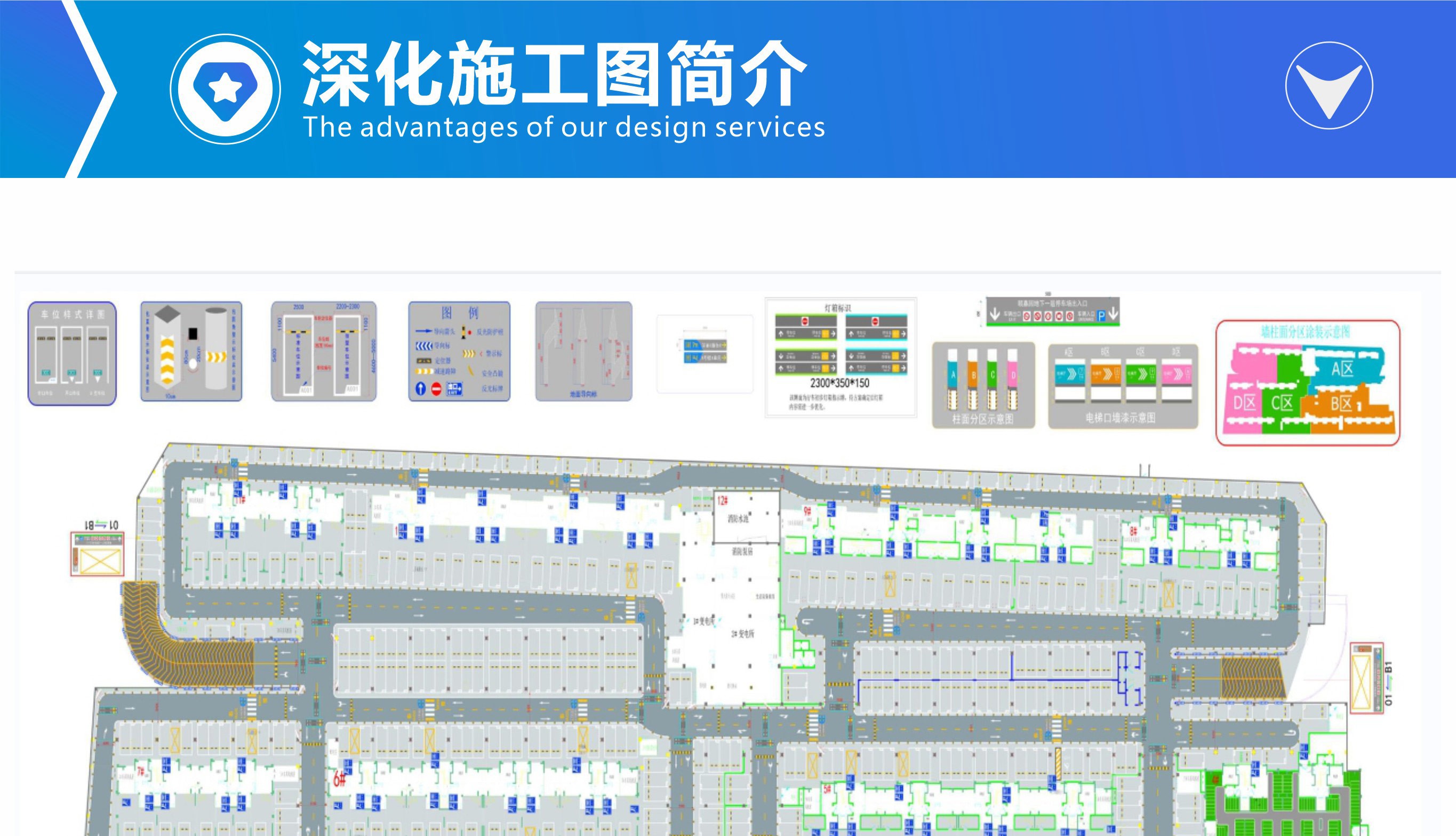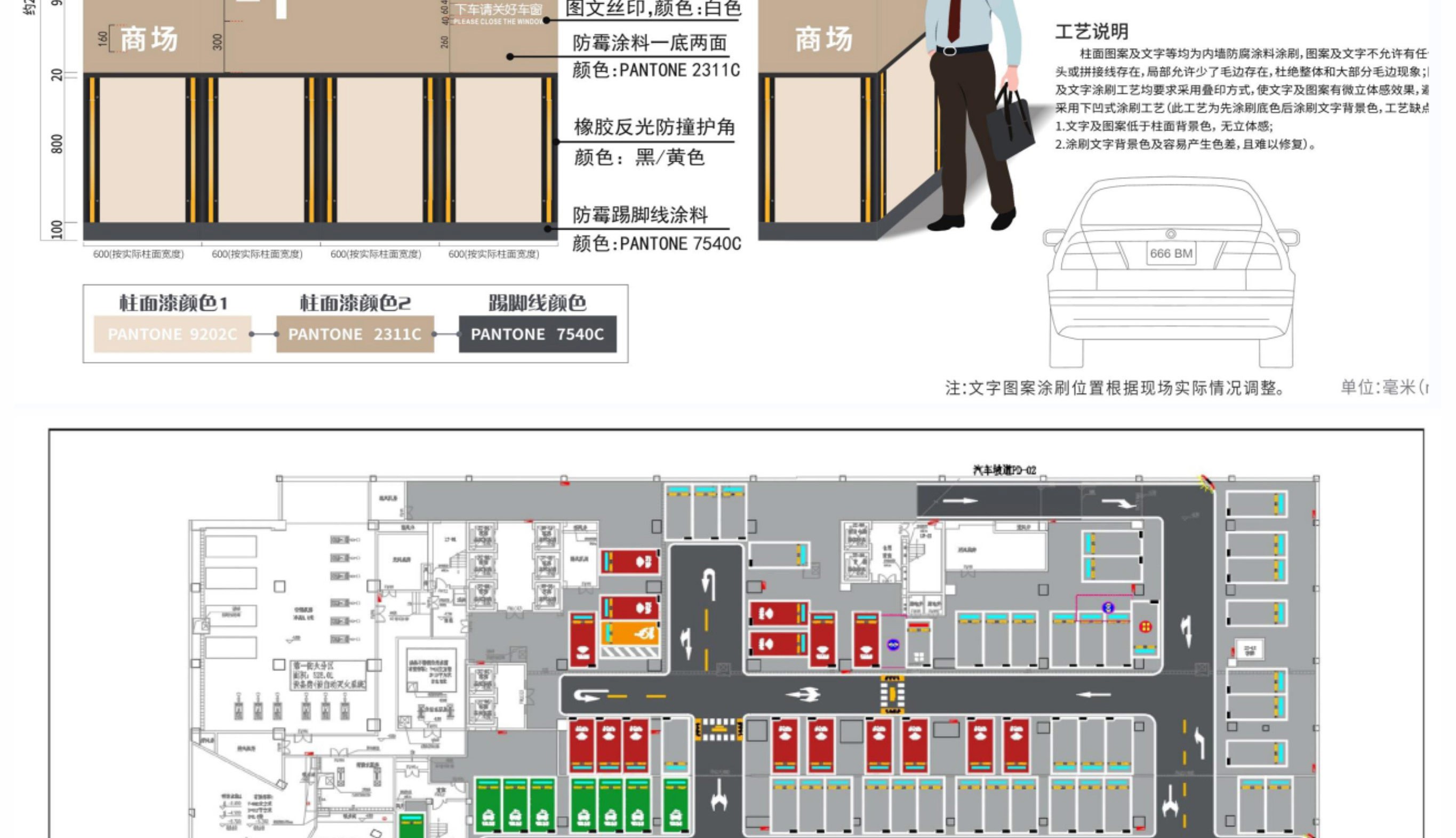 主要對車庫原建筑平面圖進(jìn)行二次深化設(shè)計(jì),包含停車場設(shè)計(jì)說明、施工工藝,常用交通設(shè)施工藝大樣圖及地坪漆施工圖,顏色搭配、分區(qū)范圍,墻柱面漆施工范圍,加上一般的墻柱面文字圖案等標(biāo)識指引設(shè)計(jì),工程量計(jì)算等,讓項(xiàng)目達(dá)到能施工和報價的目的。